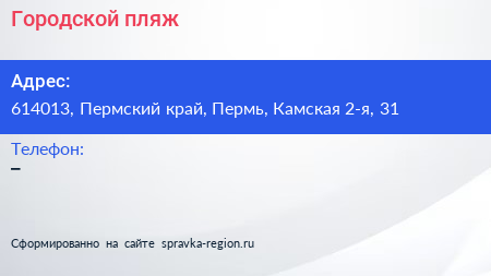 Городской пляж по адресу 614013, Пермский край, Пермь, Камская 2-я, 31 в дальнейшем Организация, размещена в следующих категориях:
