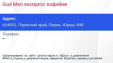 Gud Men, экспресс-кофейня по адресу 614051, Пермский край, Пермь, Юрша, 84Б в дальнейшем Организация, размещена в следующих категориях: