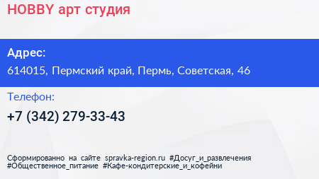 HOBBY, арт-студия по адресу 614015, Пермский край, Пермь, Советская, 46 в дальнейшем Организация, размещена в следующих категориях: