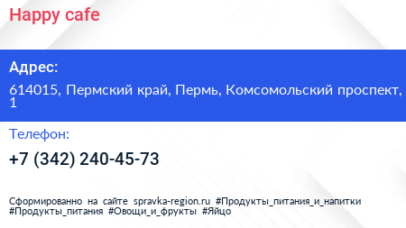 Happy cafe по адресу 614015, Пермский край, Пермь, Комсомольский проспект, 1 в дальнейшем Организация, размещена в следующих категориях: