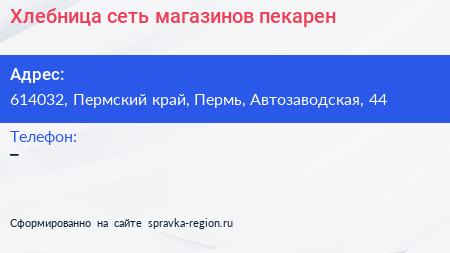 Хлебница, сеть магазинов-пекарен по адресу 614032, Пермский край, Пермь, Автозаводская, 44 в дальнейшем Организация, размещена в следующих категориях: