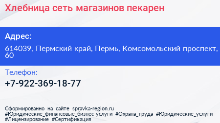 Хлебница, сеть магазинов-пекарен по адресу 614039, Пермский край, Пермь, Комсомольский проспект, 60 в дальнейшем Организация, размещена в следующих категориях: