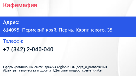 Кафемафия по адресу 614095, Пермский край, Пермь, Карпинского, 35 в дальнейшем Организация, размещена в следующих категориях: