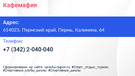 Кафемафия по адресу 614023, Пермский край, Пермь, Калинина, 64 в дальнейшем Организация, размещена в следующих категориях: