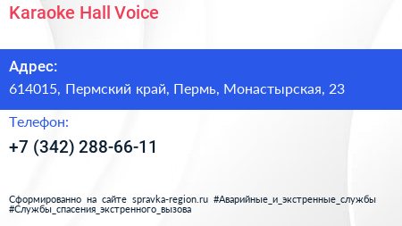 Karaoke Hall Voice по адресу 614015, Пермский край, Пермь, Монастырская, 23 в дальнейшем Организация, размещена в следующих категориях: