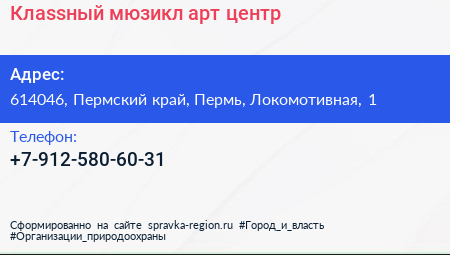 Клаssный мюзикл, арт-центр по адресу 614046, Пермский край, Пермь, Локомотивная, 1 в дальнейшем Организация, размещена в следующих категориях: