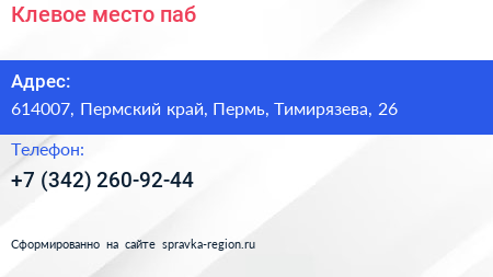 Клевое место, паб по адресу 614007, Пермский край, Пермь, Тимирязева, 26 в дальнейшем Организация, размещена в следующих категориях: