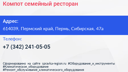 Компот, семейный ресторан по адресу 614039, Пермский край, Пермь, Сибирская, 47а в дальнейшем Организация, размещена в следующих категориях: