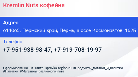 Kremlin Nuts, кофейня по адресу 614065, Пермский край, Пермь, шоссе Космонавтов, 162Б в дальнейшем Организация, размещена в следующих категориях: