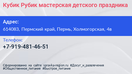 Кубик-Рубик, мастерская детского праздника по адресу 614083, Пермский край, Пермь, Холмогорская, 4в в дальнейшем Организация, размещена в следующих категориях: