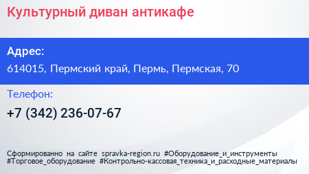 Культурный диван, антикафе по адресу 614015, Пермский край, Пермь, Пермская, 70 в дальнейшем Организация, размещена в следующих категориях: