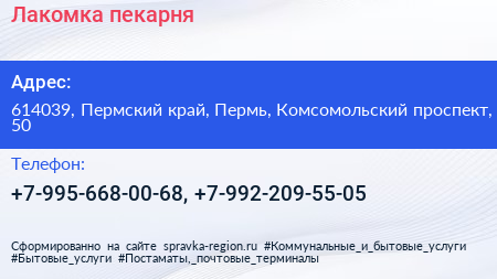 Лакомка, пекарня по адресу 614039, Пермский край, Пермь, Комсомольский проспект, 50 в дальнейшем Организация, размещена в следующих категориях: