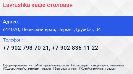 Lavrushka, кафе-столовая по адресу 614070, Пермский край, Пермь, Дружбы, 34 в дальнейшем Организация, размещена в следующих категориях:
