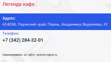 Легенда, кафе по адресу 614038, Пермский край, Пермь, Академика Веденеева, 41 в дальнейшем Организация, размещена в следующих категориях: