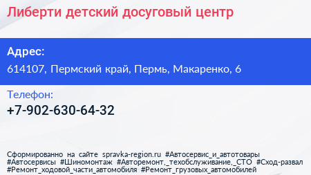 Либерти, детский досуговый центр по адресу 614107, Пермский край, Пермь, Макаренко, 6 в дальнейшем Организация, размещена в следующих категориях: