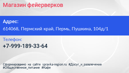Магазин фейерверков по адресу 614068, Пермский край, Пермь, Пушкина, 104д/1 в дальнейшем Организация, размещена в следующих категориях:
