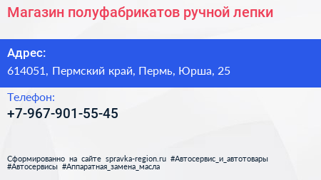 Магазин полуфабрикатов ручной лепки по адресу 614051, Пермский край, Пермь, Юрша, 25 в дальнейшем Организация, размещена в следующих категориях: