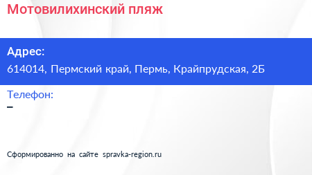 Мотовилихинский пляж по адресу 614014, Пермский край, Пермь, Крайпрудская, 2Б в дальнейшем Организация, размещена в следующих категориях: