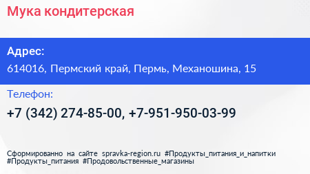 Мука, кондитерская по адресу 614016, Пермский край, Пермь, Механошина, 15 в дальнейшем Организация, размещена в следующих категориях: