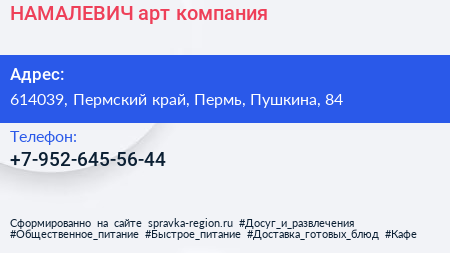 НАМАЛЕВИЧ, арт-компания по адресу 614039, Пермский край, Пермь, Пушкина, 84 в дальнейшем Организация, размещена в следующих категориях:
