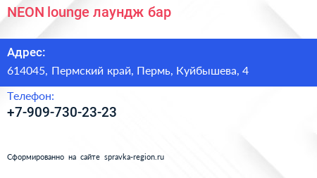 NEON lounge, лаундж-бар по адресу 614045, Пермский край, Пермь, Куйбышева, 4 в дальнейшем Организация, размещена в следующих категориях: