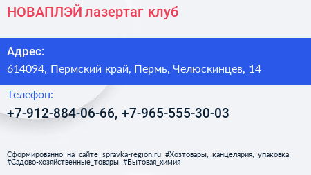 НОВАПЛЭЙ, лазертаг-клуб по адресу 614094, Пермский край, Пермь, Челюскинцев, 14 в дальнейшем Организация, размещена в следующих категориях: