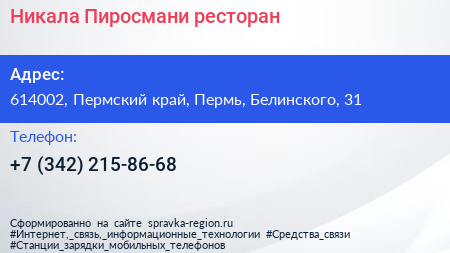 Никала Пиросмани, ресторан по адресу 614002, Пермский край, Пермь, Белинского, 31 в дальнейшем Организация, размещена в следующих категориях:
