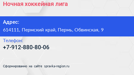 Ночная хоккейная лига по адресу 614111, Пермский край, Пермь, Обвинская, 9 в дальнейшем Организация, размещена в следующих категориях:
