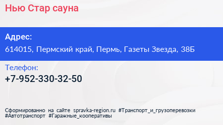 Нью Стар, сауна по адресу 614015, Пермский край, Пермь, Газеты Звезда, 38Б в дальнейшем Организация, размещена в следующих категориях: