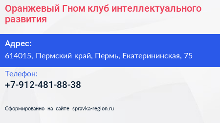 Оранжевый Гном, клуб интеллектуального развития по адресу 614015, Пермский край, Пермь, Екатерининская, 75 в дальнейшем Организация, размещена в следующих категориях: