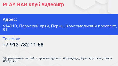 PLAY BAR, клуб видеоигр по адресу 614010, Пермский край, Пермь, Комсомольский проспект, 81 в дальнейшем Организация, размещена в следующих категориях: