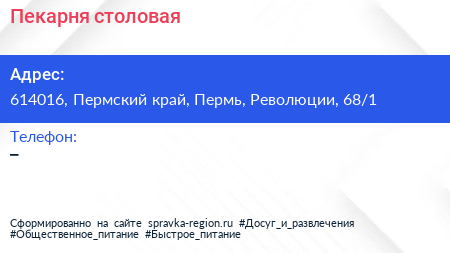 Пекарня-столовая по адресу 614016, Пермский край, Пермь, Революции, 68/1 в дальнейшем Организация, размещена в следующих категориях: