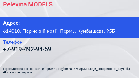 Pelevina MODELS по адресу 614010, Пермский край, Пермь, Куйбышева, 95Б в дальнейшем Организация, размещена в следующих категориях: