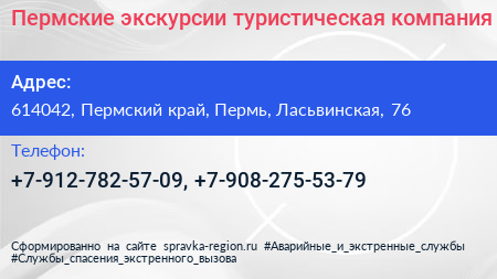 Пермские экскурсии, туристическая компания по адресу 614042, Пермский край, Пермь, Ласьвинская, 76 в дальнейшем Организация, размещена в следующих категориях: