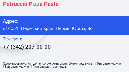 Petruccio.Pizza & Pasta по адресу 614051, Пермский край, Пермь, Юрша, 86 в дальнейшем Организация, размещена в следующих категориях:
