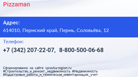 Pizzaman по адресу 614010, Пермский край, Пермь, Соловьёва, 12 в дальнейшем Организация, размещена в следующих категориях:
