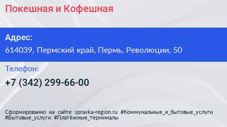 Покешная и Кофешная по адресу 614039, Пермский край, Пермь, Революции, 50 в дальнейшем Организация, размещена в следующих категориях: