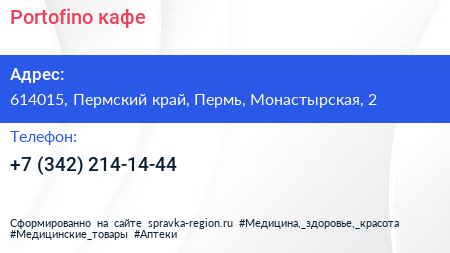 Portofino, кафе по адресу 614015, Пермский край, Пермь, Монастырская, 2 в дальнейшем Организация, размещена в следующих категориях: