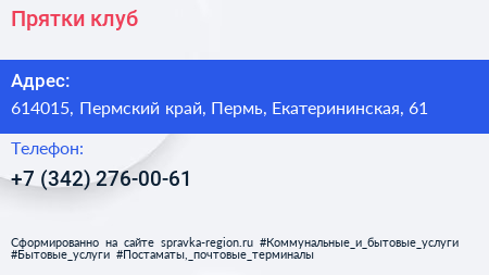 Прятки, клуб по адресу 614015, Пермский край, Пермь, Екатерининская, 61 в дальнейшем Организация, размещена в следующих категориях: