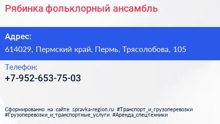 Рябинка, фольклорный ансамбль по адресу 614029, Пермский край, Пермь, Трясолобова, 105 в дальнейшем Организация, размещена в следующих категориях: