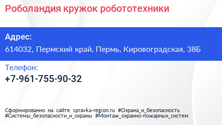 Роболандия, кружок робототехники по адресу 614032, Пермский край, Пермь, Кировоградская, 38Б в дальнейшем Организация, размещена в следующих категориях: