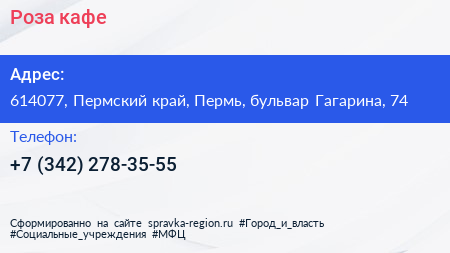 Роза, кафе по адресу 614077, Пермский край, Пермь, бульвар Гагарина, 74 в дальнейшем Организация, размещена в следующих категориях:
