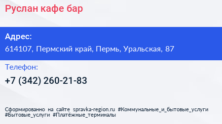 Руслан, кафе-бар по адресу 614107, Пермский край, Пермь, Уральская, 87 в дальнейшем Организация, размещена в следующих категориях: