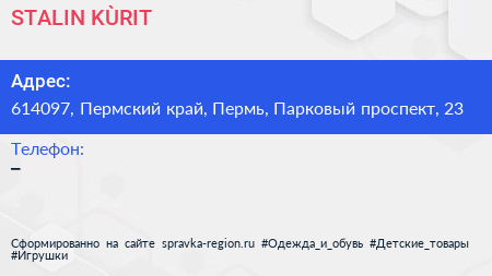 STALIN KÙRIT по адресу 614097, Пермский край, Пермь, Парковый проспект, 23 в дальнейшем Организация, размещена в следующих категориях: