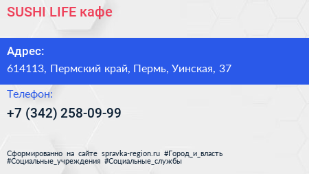 SUSHI LIFE, кафе по адресу 614113, Пермский край, Пермь, Уинская, 37 в дальнейшем Организация, размещена в следующих категориях: