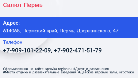 Салют Пермь по адресу 614068, Пермский край, Пермь, Дзержинского, 47 в дальнейшем Организация, размещена в следующих категориях: