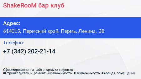 ShakeRooM, бар-клуб по адресу 614015, Пермский край, Пермь, Ленина, 38 в дальнейшем Организация, размещена в следующих категориях: