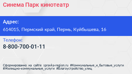 Синема Парк, кинотеатр по адресу 614015, Пермский край, Пермь, Куйбышева, 16 в дальнейшем Организация, размещена в следующих категориях: