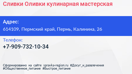 Сливки Оливки, кулинарная мастерская по адресу 614109, Пермский край, Пермь, Калинина, 26 в дальнейшем Организация, размещена в следующих категориях: