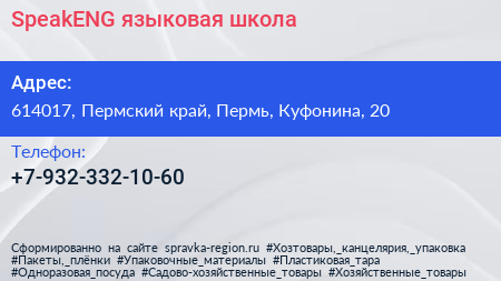 SpeakENG, языковая школа по адресу 614017, Пермский край, Пермь, Куфонина, 20 в дальнейшем Организация, размещена в следующих категориях: